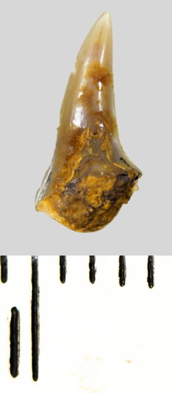 Коронка мелкого бокового зуба серого цвета, колюще-режущего типа, S-образно изогнутая, с гладким режущим краем. С лингвальной стороны у основания коронки на эмали имеется скульптура в виде слабой продольной струйчатости. Корень охристый, сохранился фрагментарно