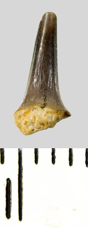 Зуб (фрагмент). Акула. Eostriatolamia subulata (Agassiz, 1843). Классификация: Хордовые Chordata, Позвоночные Vertebrata, Хрящевые рыбы Chondrichthyes, Пластиножаберные Elasmobranchii, Акулы Selachii, Ламнообразные Lamniformes, Песчаные акулы Odontaspididae