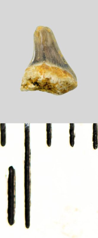 Коронка мелкого бокового зуба серого цвета, колюще-режущего типа, S-образно изогнутая, с гладким режущим краем. С лингвальной стороны у основания коронки на эмали имеется скульптура в виде слабой продольной струйчатости. Корень охристый, сохранился фрагментарно