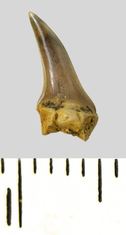 Коронка мелкого бокового зуба серого цвета, колюще-режущего типа, S-образно изогнутая, с гладким режущим краем. С лингвальной стороны у основания коронки на эмали имеется скульптура в виде слабой продольной струйчатости. Корень охристый, сохранился фрагментарно