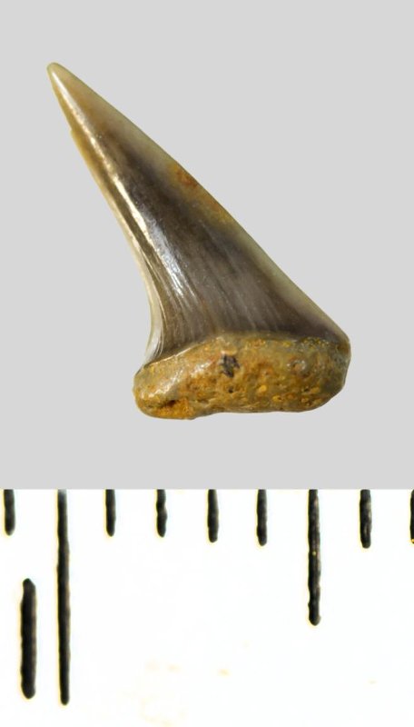 Зуб (фрагмент). Акула. Eostriatolamia subulata (Agassiz, 1843). Классификация: Хордовые Chordata, Позвоночные Vertebrata, Хрящевые рыбы Chondrichthyes, Пластиножаберные Elasmobranchii, Акулы Selachii, Ламнообразные Lamniformes, Песчаные акулы Odontaspididae