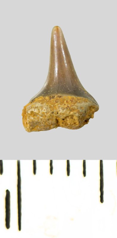 Зуб (фрагмент). Акула. Eostriatolamia subulata (Agassiz, 1843). Классификация: Хордовые Chordata, Позвоночные Vertebrata, Хрящевые рыбы Chondrichthyes, Пластиножаберные Elasmobranchii, Акулы Selachii, Ламнообразные Lamniformes, Песчаные акулы Odontaspididae