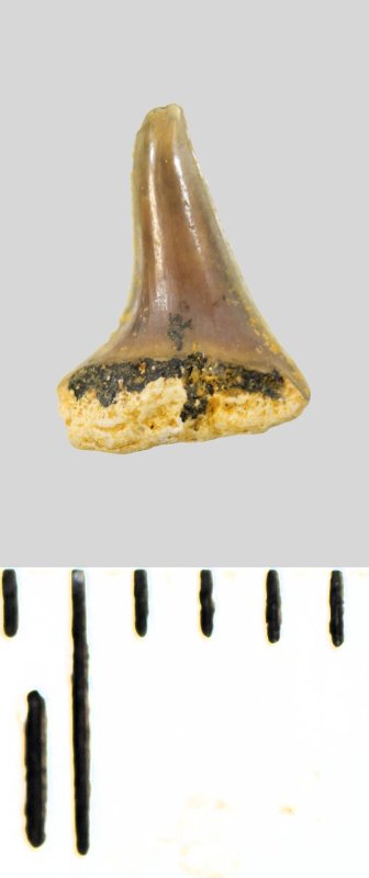Зуб (фрагмент). Акула. Eostriatolamia subulata (Agassiz, 1843). Классификация: Хордовые Chordata, Позвоночные Vertebrata, Хрящевые рыбы Chondrichthyes, Пластиножаберные Elasmobranchii, Акулы Selachii, Ламнообразные Lamniformes, Песчаные акулы Odontaspididae