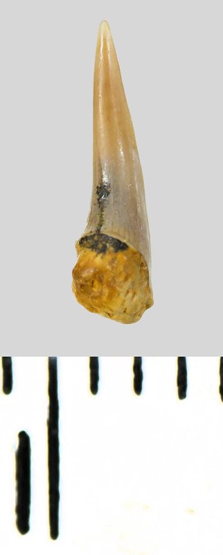 Коронка мелкого бокового зуба серого цвета, колюще-режущего типа, S-образно изогнутая, с гладким режущим краем. С лингвальной стороны у основания коронки на эмали имеется скульптура в виде слабой продольной струйчатости. Корень охристый, сохранился фрагментарно