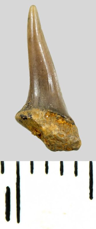 Зуб (фрагмент). Акула. Eostriatolamia subulata (Agassiz, 1843). Классификация: Хордовые Chordata, Позвоночные Vertebrata, Хрящевые рыбы Chondrichthyes, Пластиножаберные Elasmobranchii, Акулы Selachii, Ламнообразные Lamniformes, Песчаные акулы Odontaspididae
