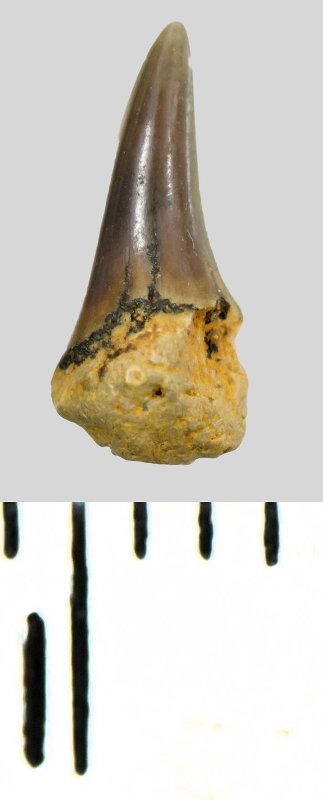 Зуб (фрагмент). Акула. Eostriatolamia subulata (Agassiz, 1843). Классификация: Хордовые Chordata, Позвоночные Vertebrata, Хрящевые рыбы Chondrichthyes, Пластиножаберные Elasmobranchii, Акулы Selachii, Ламнообразные Lamniformes, Песчаные акулы Odontaspididae