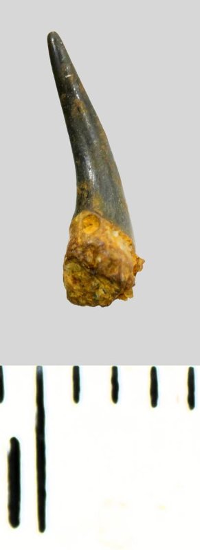 Коронка мелкого бокового зуба серого цвета, колюще-режущего типа, S-образно изогнутая, с гладким режущим краем. С лингвальной стороны у основания коронки на эмали имеется скульптура в виде слабой продольной струйчатости. Корень охристый, сохранился фрагментарно