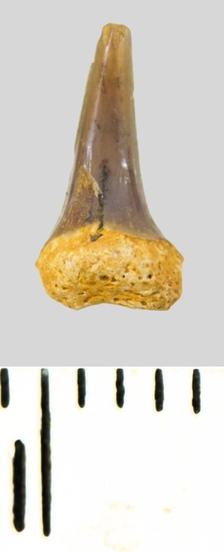 Коронка мелкого бокового зуба серого цвета, колюще-режущего типа, S-образно изогнутая, с гладким режущим краем. С лингвальной стороны у основания коронки на эмали имеется скульптура в виде слабой продольной струйчатости. Корень охристый, сохранился фрагментарно