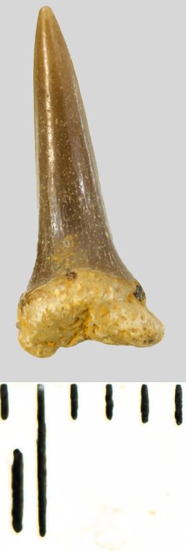 Зуб (фрагмент). Акула. Eostriatolamia subulata (Agassiz, 1843). Классификация: Хордовые Chordata, Позвоночные Vertebrata, Хрящевые рыбы Chondrichthyes, Пластиножаберные Elasmobranchii, Акулы Selachii, Ламнообразные Lamniformes, Песчаные акулы Odontaspididae