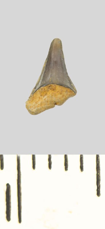 Зуб (фрагмент). Акула. Eostriatolamia subulata (Agassiz, 1843). Классификация: Хордовые Chordata, Позвоночные Vertebrata, Хрящевые рыбы Chondrichthyes, Пластиножаберные Elasmobranchii, Акулы Selachii, Ламнообразные Lamniformes, Песчаные акулы Odontaspididae