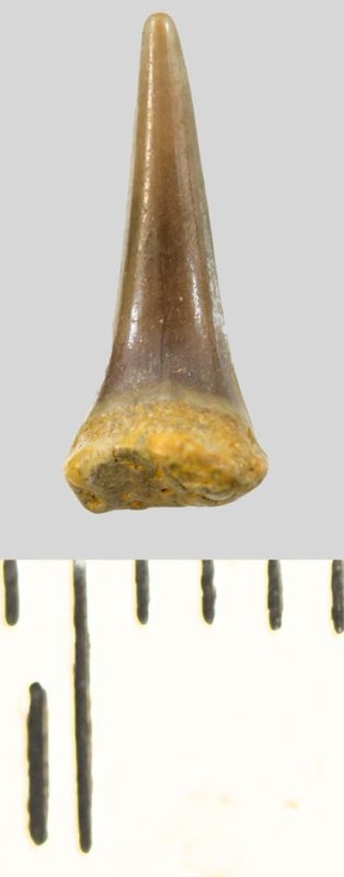 Коронка мелкого бокового зуба серого цвета, колюще-режущего типа, S-образно изогнутая, с гладким режущим краем. С лингвальной стороны у основания коронки на эмали имеется скульптура в виде слабой продольной струйчатости. Корень охристый, сохранился фрагментарно