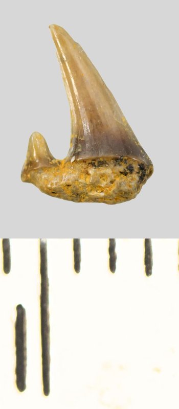 Зуб (фрагмент). Акула. Eostriatolamia subulata (Agassiz, 1843). Классификация: Хордовые Chordata, Позвоночные Vertebrata, Хрящевые рыбы Chondrichthyes, Пластиножаберные Elasmobranchii, Акулы Selachii, Ламнообразные Lamniformes, Песчаные акулы Odontaspididae