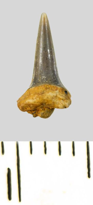 Зуб (фрагмент). Акула. Eostriatolamia subulata (Agassiz, 1843). Классификация: Хордовые Chordata, Позвоночные Vertebrata, Хрящевые рыбы Chondrichthyes, Пластиножаберные Elasmobranchii, Акулы Selachii, Ламнообразные Lamniformes, Песчаные акулы Odontaspididae