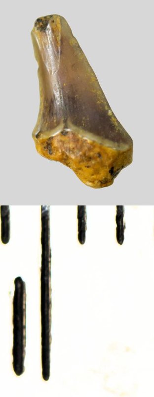 Коронка мелкого бокового зуба серого цвета, колюще-режущего типа, S-образно изогнутая, с гладким режущим краем. С лингвальной стороны у основания коронки на эмали имеется скульптура в виде слабой продольной струйчатости. Корень охристый, сохранился фрагментарно