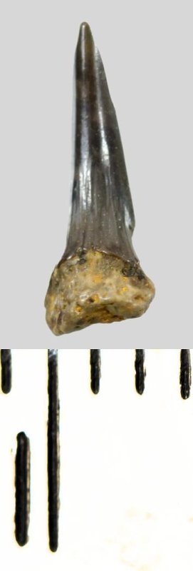 Зуб (фрагмент). Акула. Eostriatolamia subulata (Agassiz, 1843). Классификация: Хордовые Chordata, Позвоночные Vertebrata, Хрящевые рыбы Chondrichthyes, Пластиножаберные Elasmobranchii, Акулы Selachii, Ламнообразные Lamniformes, Песчаные акулы Odontaspididae