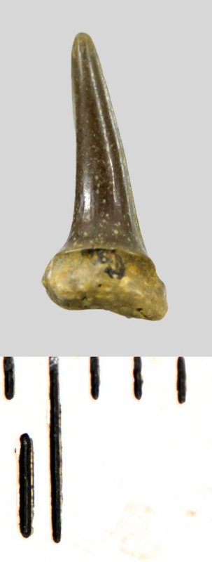 Коронка мелкого бокового зуба серого цвета, колюще-режущего типа, S-образно изогнутая, с гладким режущим краем. С лингвальной стороны у основания коронки на эмали имеется скульптура в виде слабой продольной струйчатости. Корень охристый, сохранился фрагментарно