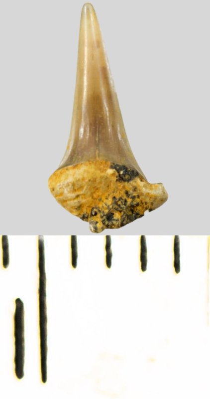 Зуб (фрагмент). Акула. Eostriatolamia subulata (Agassiz, 1843). Классификация: Хордовые Chordata, Позвоночные Vertebrata, Хрящевые рыбы Chondrichthyes, Пластиножаберные Elasmobranchii, Акулы Selachii, Ламнообразные Lamniformes, Песчаные акулы Odontaspididae