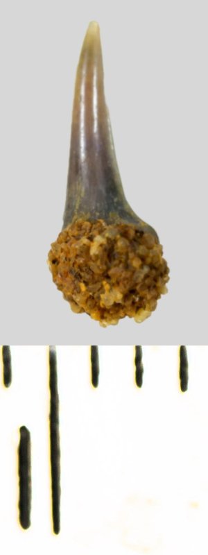 Коронка мелкого бокового зуба серого цвета, колюще-режущего типа, S-образно изогнутая, с гладким режущим краем. С лингвальной стороны у основания коронки на эмали имеется скульптура в виде слабой продольной струйчатости. Корень охристый, сохранился фрагментарно