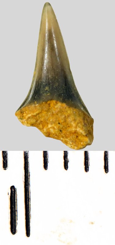 Зуб (фрагмент). Акула. Eostriatolamia subulata (Agassiz, 1843). Классификация: Хордовые Chordata, Позвоночные Vertebrata, Хрящевые рыбы Chondrichthyes, Пластиножаберные Elasmobranchii, Акулы Selachii, Ламнообразные Lamniformes, Песчаные акулы Odontaspididae