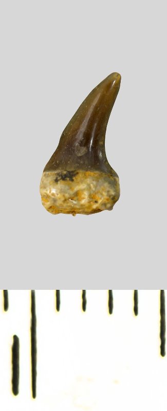 Коронка мелкого бокового зуба серого цвета, колюще-режущего типа, S-образно изогнутая, с гладким режущим краем. С лингвальной стороны у основания коронки на эмали имеется скульптура в виде слабой продольной струйчатости. Корень охристый, сохранился фрагментарно