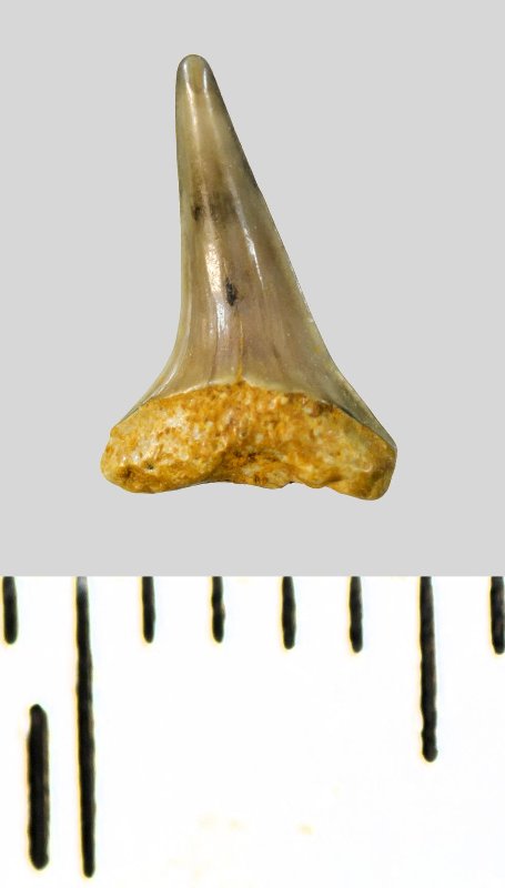 Зуб (фрагмент). Акула. Eostriatolamia subulata (Agassiz, 1843). Классификация: Хордовые Chordata, Позвоночные Vertebrata, Хрящевые рыбы Chondrichthyes, Пластиножаберные Elasmobranchii, Акулы Selachii, Ламнообразные Lamniformes, Песчаные акулы Odontaspididae