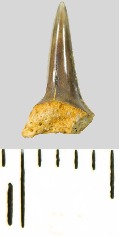 Зуб (фрагмент). Акула. Eostriatolamia subulata (Agassiz, 1843). Классификация: Хордовые Chordata, Позвоночные Vertebrata, Хрящевые рыбы Chondrichthyes, Пластиножаберные Elasmobranchii, Акулы Selachii, Ламнообразные Lamniformes, Песчаные акулы Odontaspididae