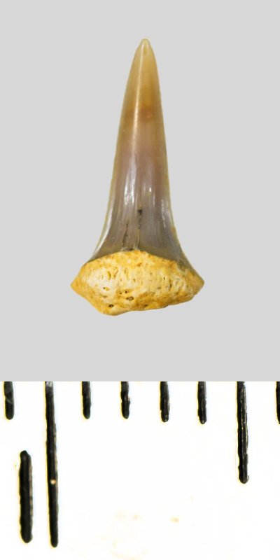 Зуб (фрагмент). Акула. Eostriatolamia subulata (Agassiz, 1843). Классификация: Хордовые Chordata, Позвоночные Vertebrata, Хрящевые рыбы Chondrichthyes, Пластиножаберные Elasmobranchii, Акулы Selachii, Ламнообразные Lamniformes, Песчаные акулы Odontaspididae
