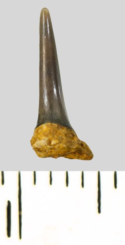 Зуб (фрагмент). Акула. Eostriatolamia subulata (Agassiz, 1843). Классификация: Хордовые Chordata, Позвоночные Vertebrata, Хрящевые рыбы Chondrichthyes, Пластиножаберные Elasmobranchii, Акулы Selachii, Ламнообразные Lamniformes, Песчаные акулы Odontaspididae