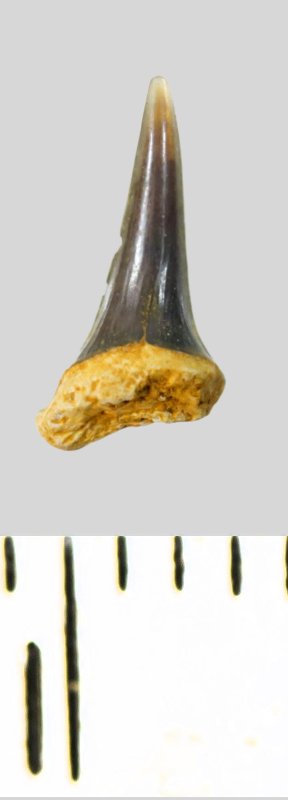 Зуб (фрагмент). Акула. Eostriatolamia subulata (Agassiz, 1843). Классификация: Хордовые Chordata, Позвоночные Vertebrata, Хрящевые рыбы Chondrichthyes, Пластиножаберные Elasmobranchii, Акулы Selachii, Ламнообразные Lamniformes, Песчаные акулы Odontaspididae