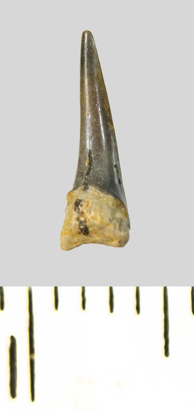 Зуб (фрагмент). Акула. Eostriatolamia subulata (Agassiz, 1843). Классификация: Хордовые Chordata, Позвоночные Vertebrata, Хрящевые рыбы Chondrichthyes, Пластиножаберные Elasmobranchii, Акулы Selachii, Ламнообразные Lamniformes, Песчаные акулы Odontaspididae