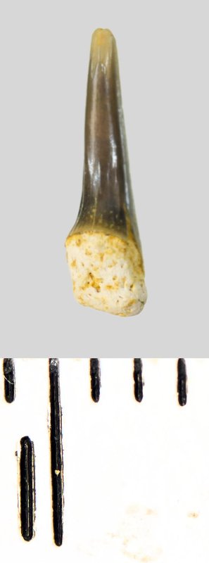 Коронка мелкого бокового зуба серого цвета, колюще-режущего типа, S-образно изогнутая, с гладким режущим краем. С лингвальной стороны у основания коронки на эмали имеется скульптура в виде слабой продольной струйчатости. Корень охристый, сохранился фрагментарно