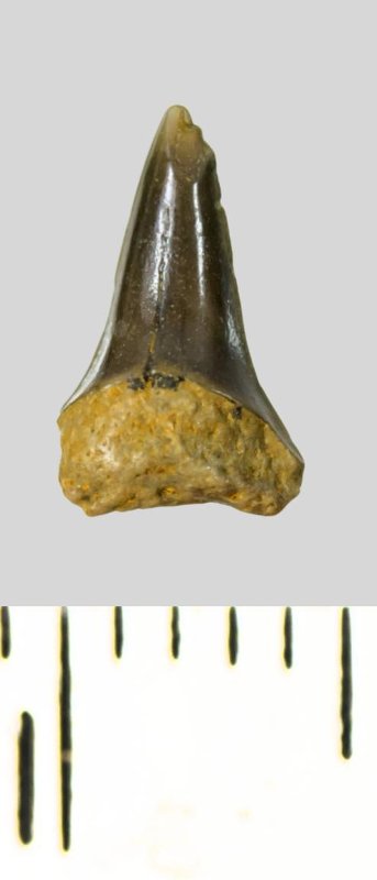 Зуб (фрагмент). Акула. Eostriatolamia subulata (Agassiz, 1843). Классификация: Хордовые Chordata, Позвоночные Vertebrata, Хрящевые рыбы Chondrichthyes, Пластиножаберные Elasmobranchii, Акулы Selachii, Ламнообразные Lamniformes, Песчаные акулы Odontaspididae