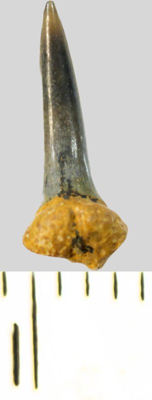 Коронка мелкого бокового зуба серого цвета, колюще-режущего типа, S-образно изогнутая, с гладким режущим краем. С лингвальной стороны у основания коронки на эмали имеется скульптура в виде слабой продольной струйчатости. Корень охристый, сохранился фрагментарно