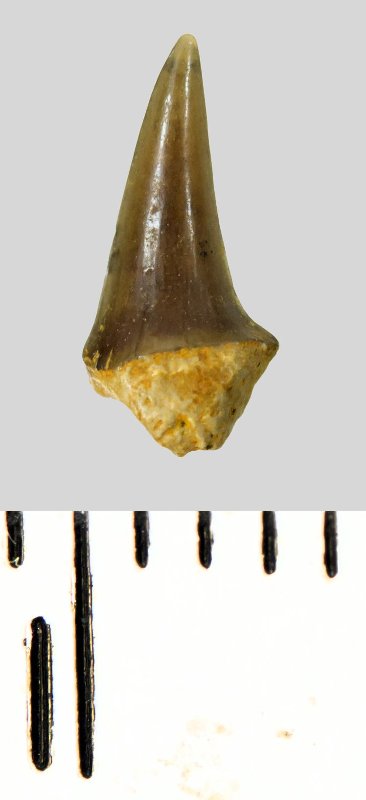 Зуб (фрагмент). Акула. Eostriatolamia subulata (Agassiz, 1843). Классификация: Хордовые Chordata, Позвоночные Vertebrata, Хрящевые рыбы Chondrichthyes, Пластиножаберные Elasmobranchii, Акулы Selachii, Ламнообразные Lamniformes, Песчаные акулы Odontaspididae