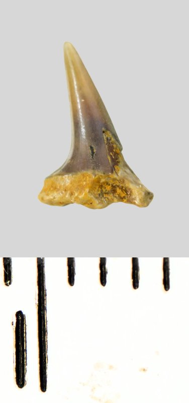 Зуб (фрагмент). Акула. Eostriatolamia subulata (Agassiz, 1843). Классификация: Хордовые Chordata, Позвоночные Vertebrata, Хрящевые рыбы Chondrichthyes, Пластиножаберные Elasmobranchii, Акулы Selachii, Ламнообразные Lamniformes, Песчаные акулы Odontaspididae