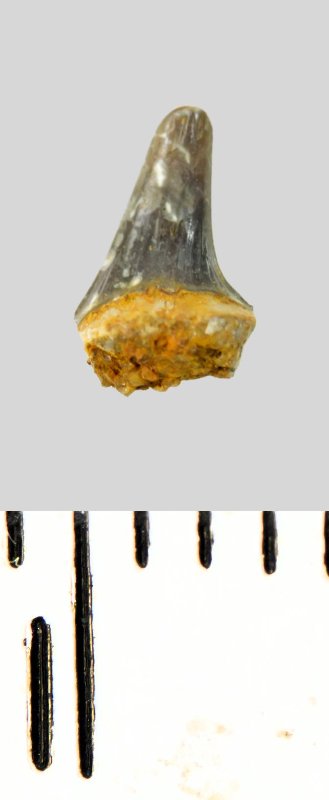 Зуб (фрагмент). Акула. Eostriatolamia subulata (Agassiz, 1843). Классификация: Хордовые Chordata, Позвоночные Vertebrata, Хрящевые рыбы Chondrichthyes, Пластиножаберные Elasmobranchii, Акулы Selachii, Ламнообразные Lamniformes, Песчаные акулы Odontaspididae