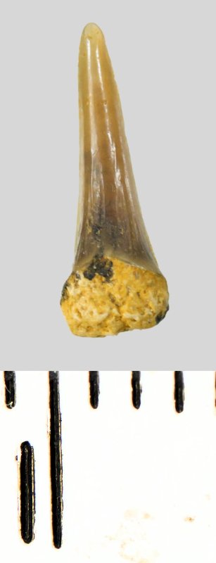 Зуб (фрагмент). Акула. Eostriatolamia subulata (Agassiz, 1843). Классификация: Хордовые Chordata, Позвоночные Vertebrata, Хрящевые рыбы Chondrichthyes, Пластиножаберные Elasmobranchii, Акулы Selachii, Ламнообразные Lamniformes, Песчаные акулы Odontaspididae