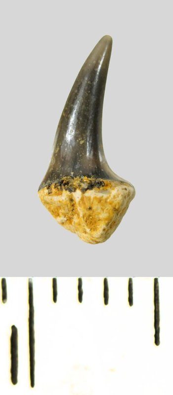 Коронка мелкого бокового зуба серого цвета, колюще-режущего типа, S-образно изогнутая, с гладким режущим краем. С лингвальной стороны у основания коронки на эмали имеется скульптура в виде слабой продольной струйчатости. Корень охристый, сохранился фрагментарно