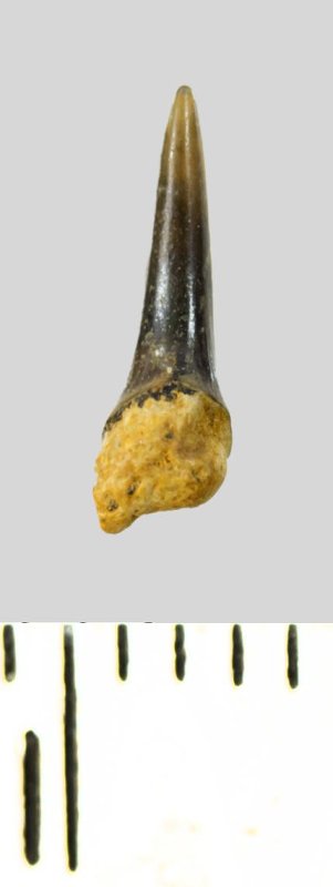 Коронка мелкого бокового зуба серого цвета, колюще-режущего типа, S-образно изогнутая, с гладким режущим краем. С лингвальной стороны у основания коронки на эмали имеется скульптура в виде слабой продольной струйчатости. Корень охристый, сохранился фрагментарно