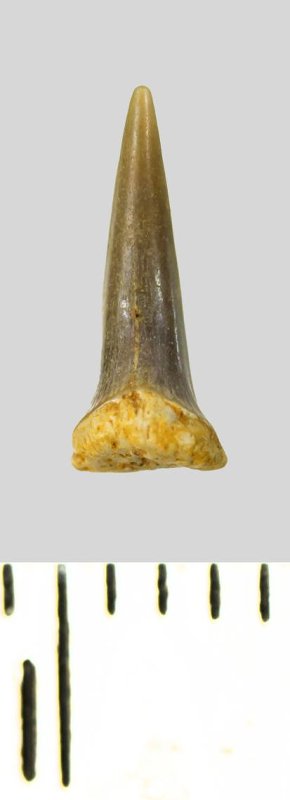 Зуб (фрагмент). Акула. Eostriatolamia subulata (Agassiz, 1843). Классификация: Хордовые Chordata, Позвоночные Vertebrata, Хрящевые рыбы Chondrichthyes, Пластиножаберные Elasmobranchii, Акулы Selachii, Ламнообразные Lamniformes, Песчаные акулы Odontaspididae