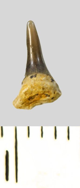 Зуб (фрагмент). Акула. Eostriatolamia subulata (Agassiz, 1843). Классификация: Хордовые Chordata, Позвоночные Vertebrata, Хрящевые рыбы Chondrichthyes, Пластиножаберные Elasmobranchii, Акулы Selachii, Ламнообразные Lamniformes, Песчаные акулы Odontaspididae