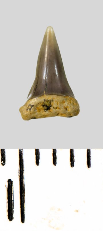 Зуб (фрагмент). Акула. Eostriatolamia subulata (Agassiz, 1843). Классификация: Хордовые Chordata, Позвоночные Vertebrata, Хрящевые рыбы Chondrichthyes, Пластиножаберные Elasmobranchii, Акулы Selachii, Ламнообразные Lamniformes, Песчаные акулы Odontaspididae