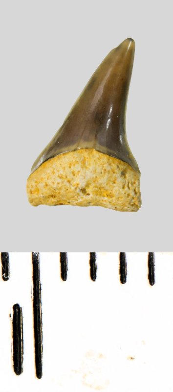 Зуб (фрагмент). Акула. Eostriatolamia subulata (Agassiz, 1843). Классификация: Хордовые Chordata, Позвоночные Vertebrata, Хрящевые рыбы Chondrichthyes, Пластиножаберные Elasmobranchii, Акулы Selachii, Ламнообразные Lamniformes, Песчаные акулы Odontaspididae