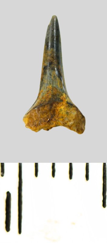 Коронка мелкого бокового зуба серого цвета, колюще-режущего типа, S-образно изогнутая, с гладким режущим краем. С лингвальной стороны у основания коронки на эмали имеется скульптура в виде слабой продольной струйчатости. Корень охристый, сохранился фрагментарно