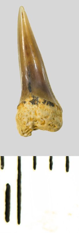 Зуб (фрагмент). Акула. Eostriatolamia subulata (Agassiz, 1843). Классификация: Хордовые Chordata, Позвоночные Vertebrata, Хрящевые рыбы Chondrichthyes, Пластиножаберные Elasmobranchii, Акулы Selachii, Ламнообразные Lamniformes, Песчаные акулы Odontaspididae