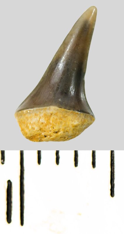 Зуб (фрагмент). Акула. Eostriatolamia subulata (Agassiz, 1843). Классификация: Хордовые Chordata, Позвоночные Vertebrata, Хрящевые рыбы Chondrichthyes, Пластиножаберные Elasmobranchii, Акулы Selachii, Ламнообразные Lamniformes, Песчаные акулы Odontaspididae