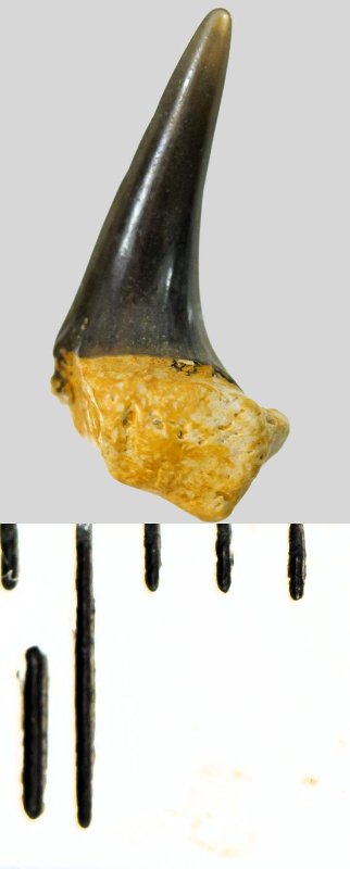 Зуб (фрагмент). Акула. Eostriatolamia subulata (Agassiz, 1843). Классификация: Хордовые Chordata, Позвоночные Vertebrata, Хрящевые рыбы Chondrichthyes, Пластиножаберные Elasmobranchii, Акулы Selachii, Ламнообразные Lamniformes, Песчаные акулы Odontaspididae