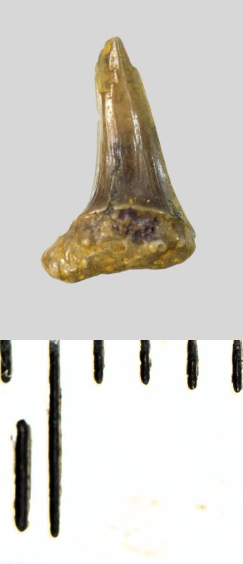 Зуб (фрагмент). Акула. Eostriatolamia subulata (Agassiz, 1843). Классификация: Хордовые Chordata, Позвоночные Vertebrata, Хрящевые рыбы Chondrichthyes, Пластиножаберные Elasmobranchii, Акулы Selachii, Ламнообразные Lamniformes, Песчаные акулы Odontaspididae