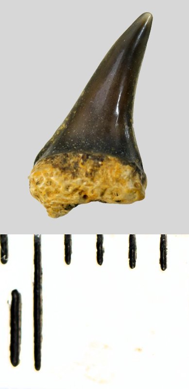 Зуб (фрагмент). Акула. Eostriatolamia subulata (Agassiz, 1843). Классификация: Хордовые Chordata, Позвоночные Vertebrata, Хрящевые рыбы Chondrichthyes, Пластиножаберные Elasmobranchii, Акулы Selachii, Ламнообразные Lamniformes, Песчаные акулы Odontaspididae