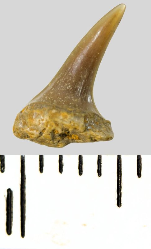 Зуб (фрагмент). Акула. Eostriatolamia subulata (Agassiz, 1843). Классификация: Хордовые Chordata, Позвоночные Vertebrata, Хрящевые рыбы Chondrichthyes, Пластиножаберные Elasmobranchii, Акулы Selachii, Ламнообразные Lamniformes, Песчаные акулы Odontaspididae
